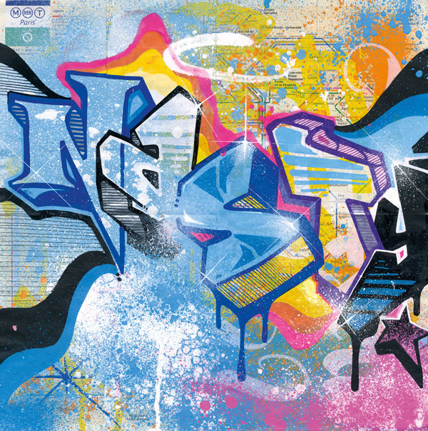 Peinture aérosol et gouache sur plan de métro