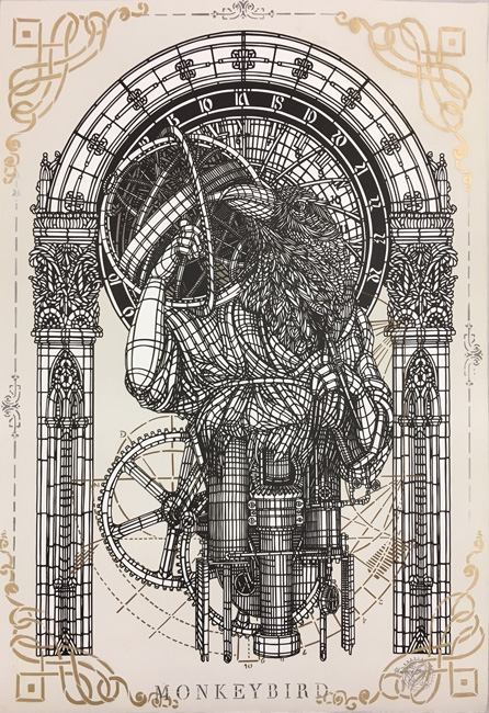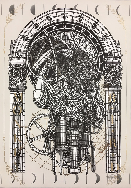 Pochoir, encre, acrylique sur toile et cadre ancien
