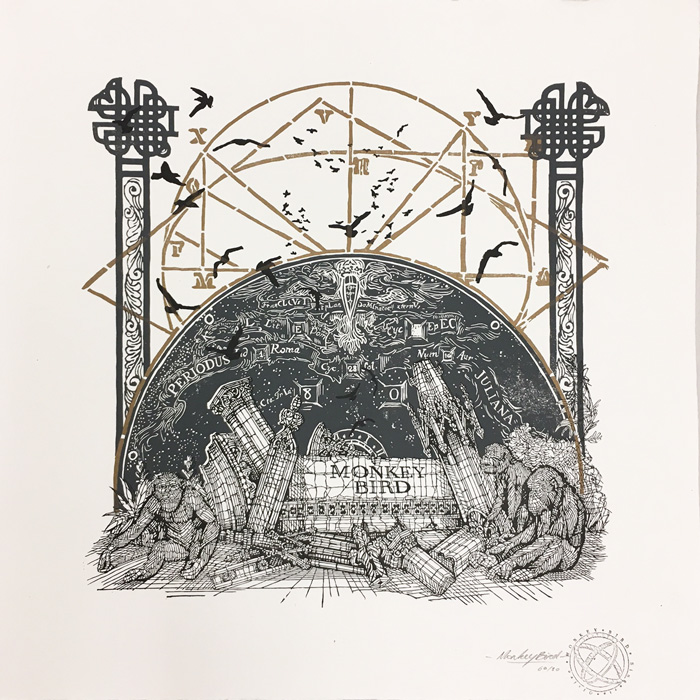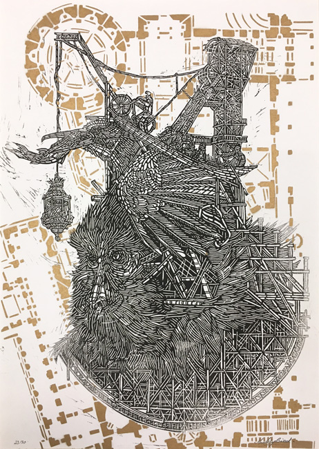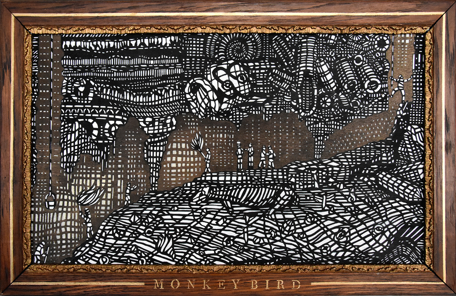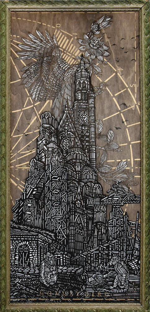 Pochoir, encre, acrylique sur bois et cadre ancien