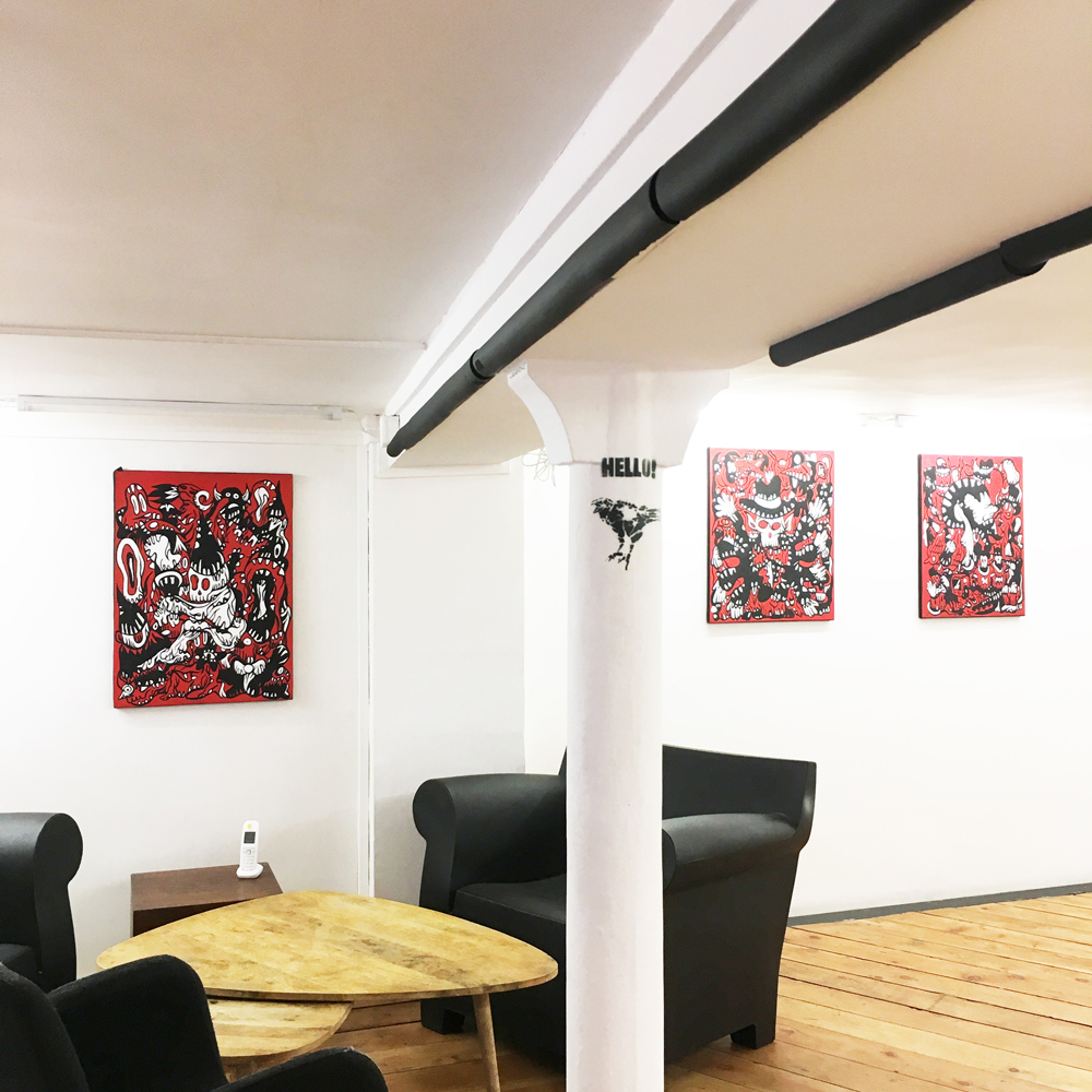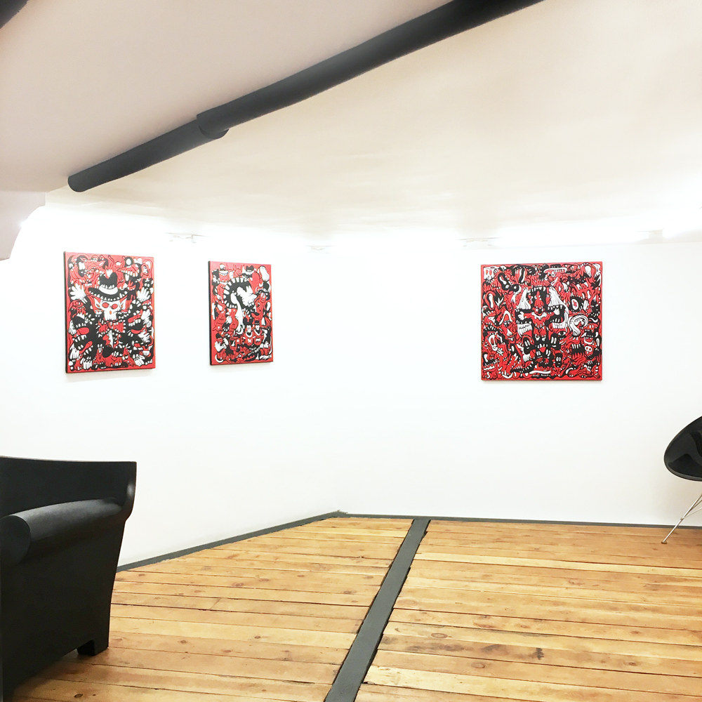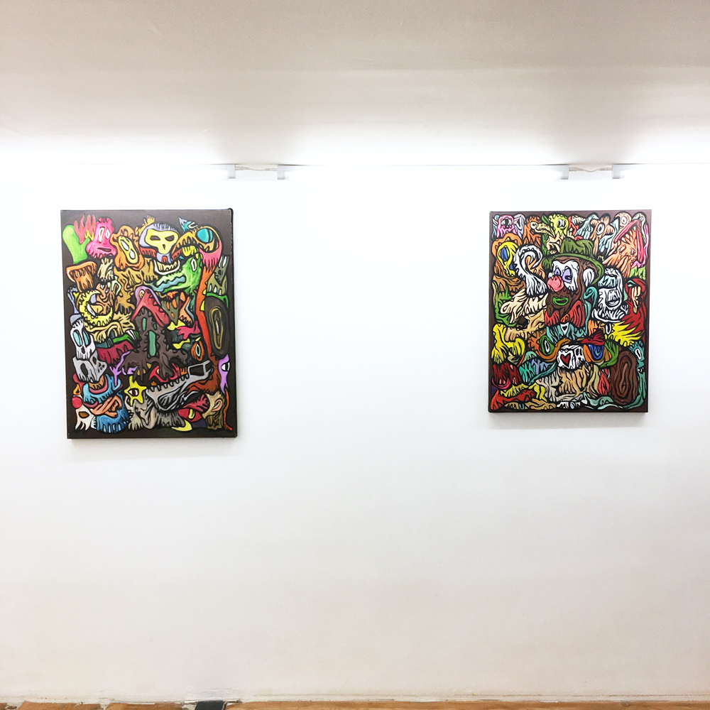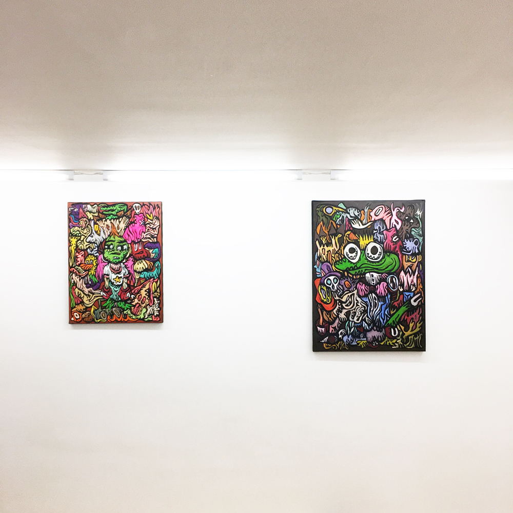 Entrée de la galerie : (de gauche à droite) Fairy Tales, Monsters Party, Diabolo, Pièces uniques, acryliques sur blouson -