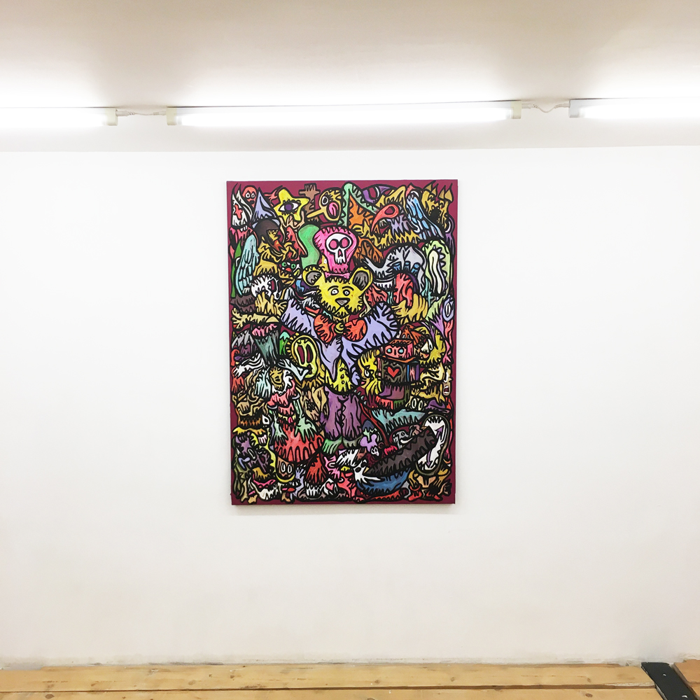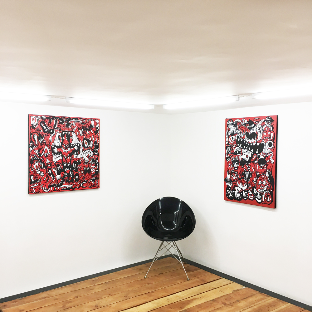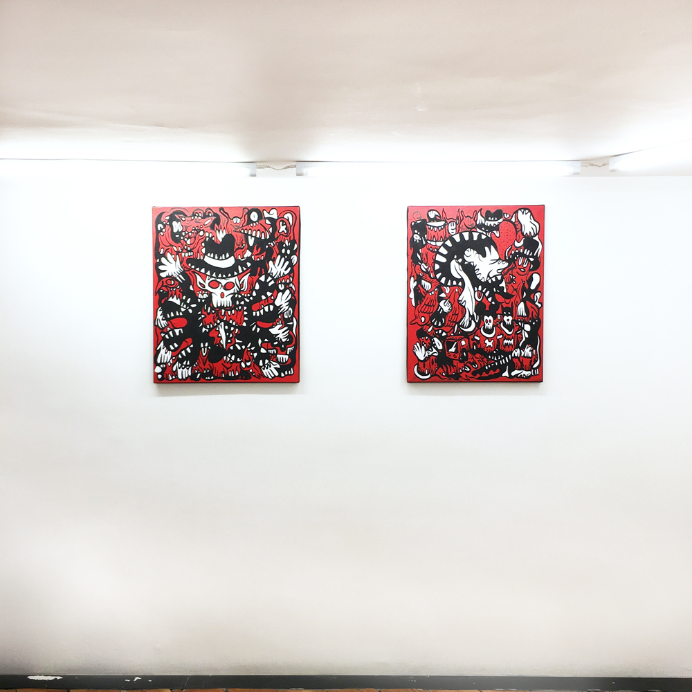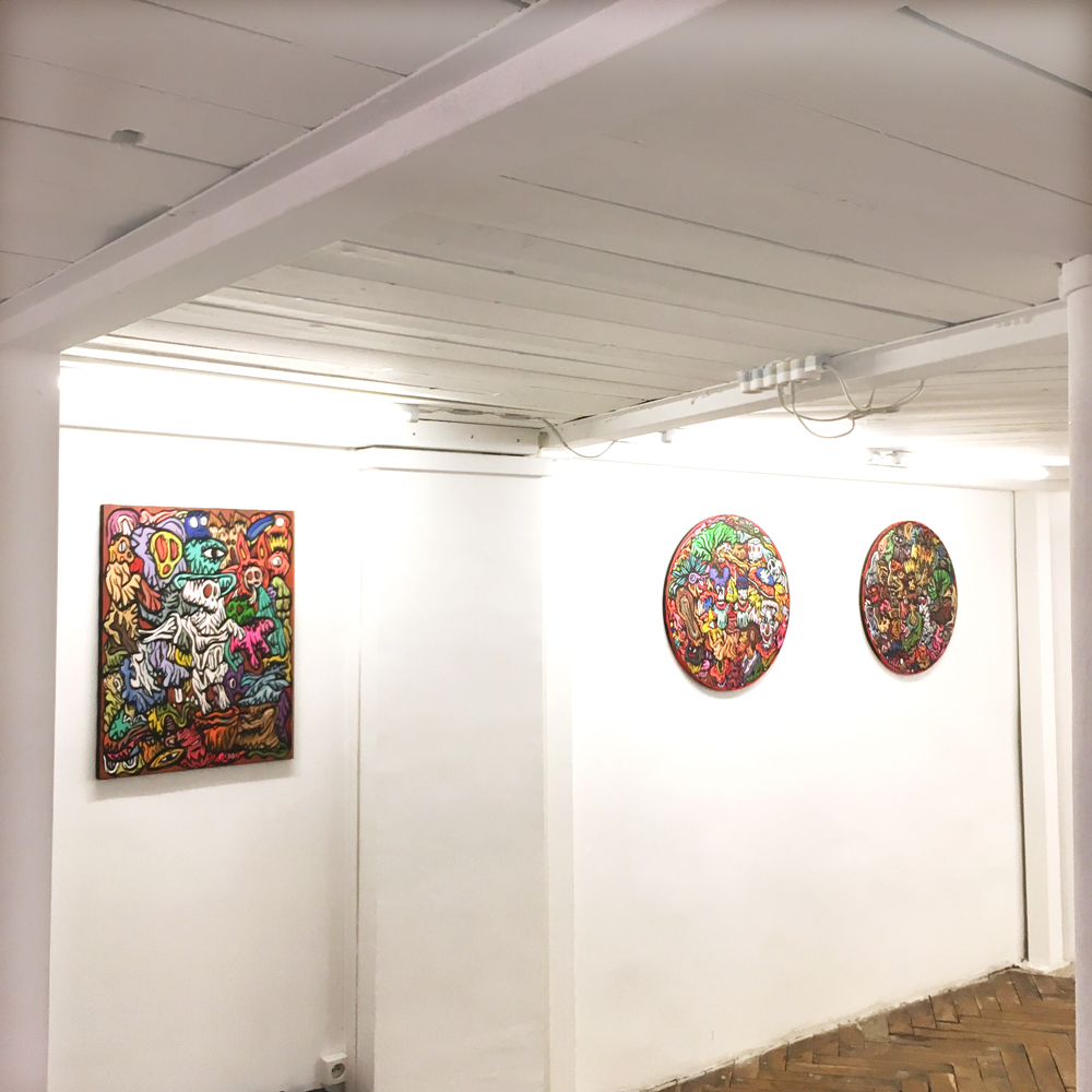 Entrée de la galerie : (de gauche à droite) Fairy Tales, Monsters Party, Diabolo, Pièces uniques, acryliques sur blouson -