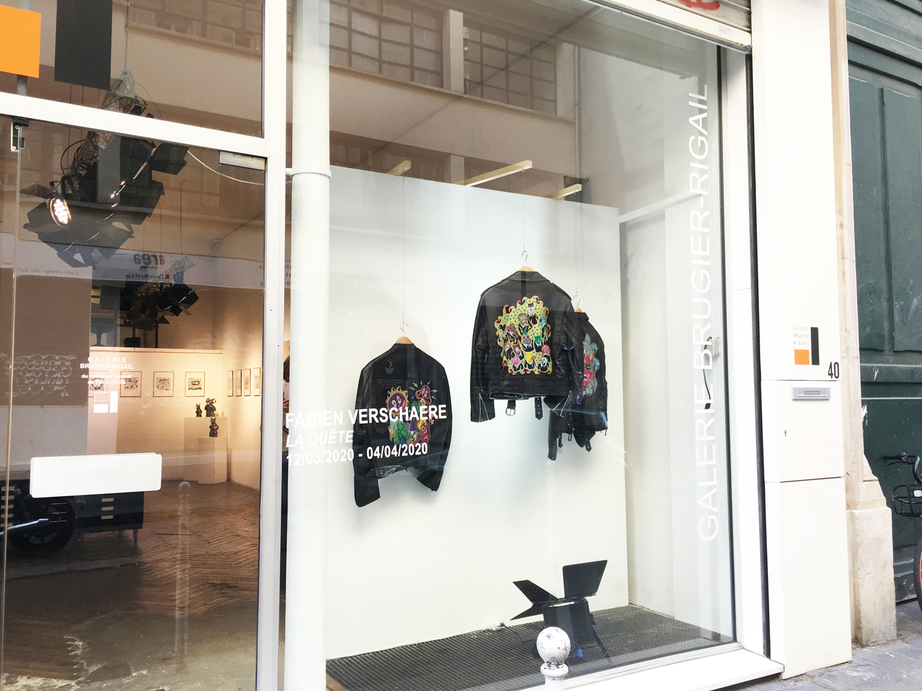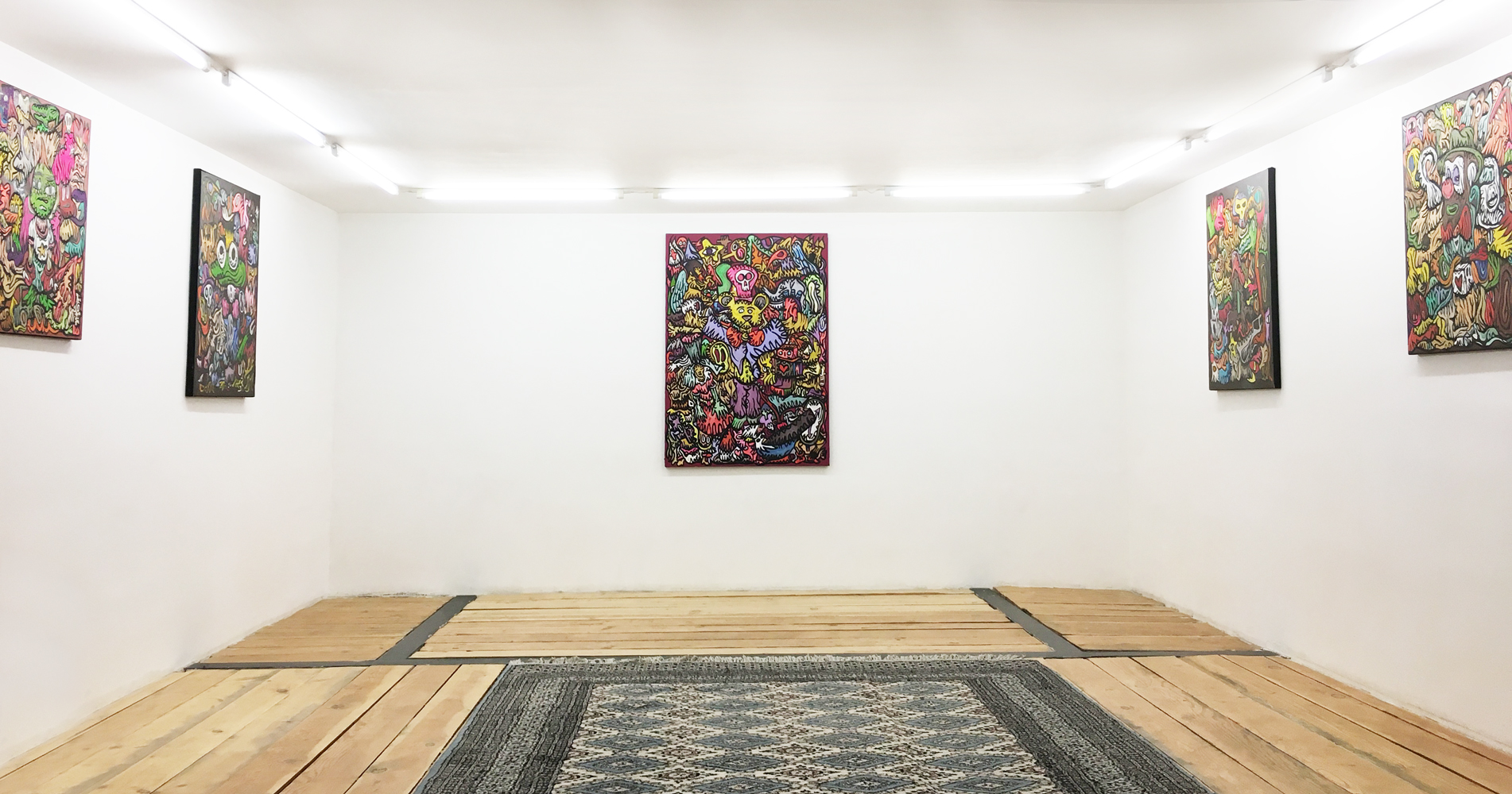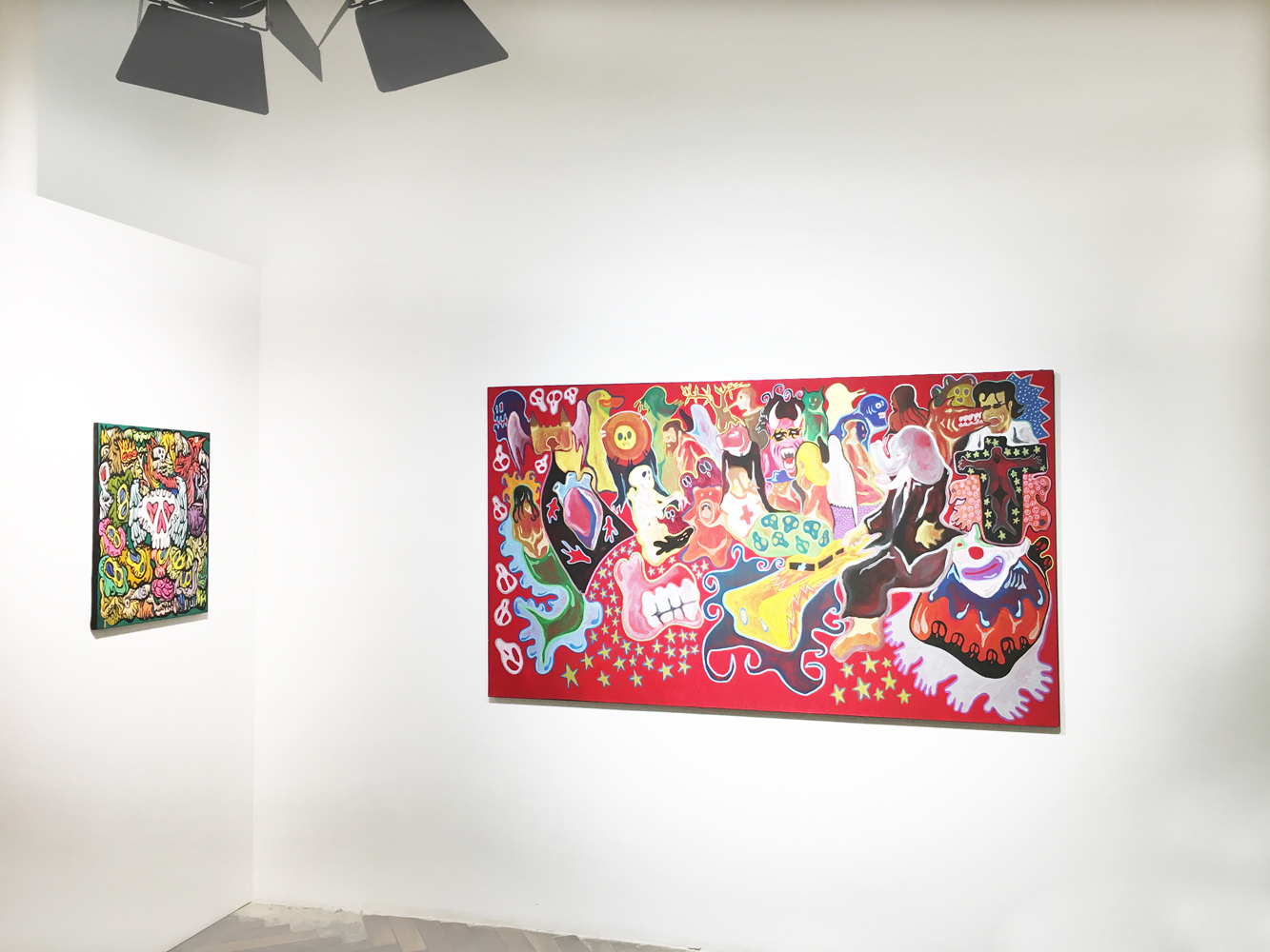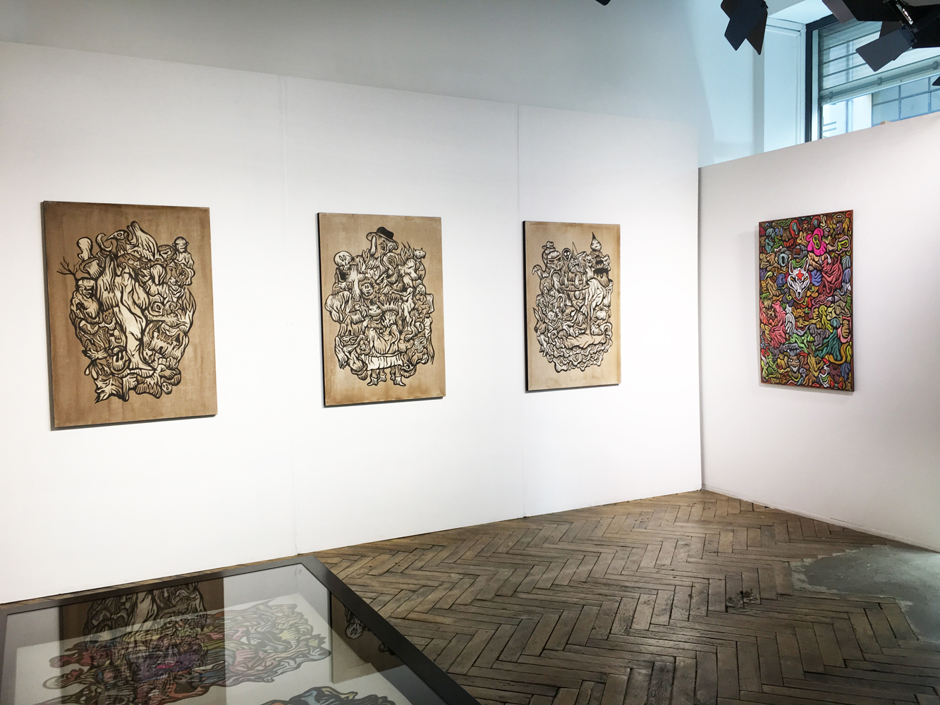 Entrée de la galerie : (de gauche à droite) Fairy Tales, Monsters Party, Diabolo, Pièces uniques, acryliques sur blouson -