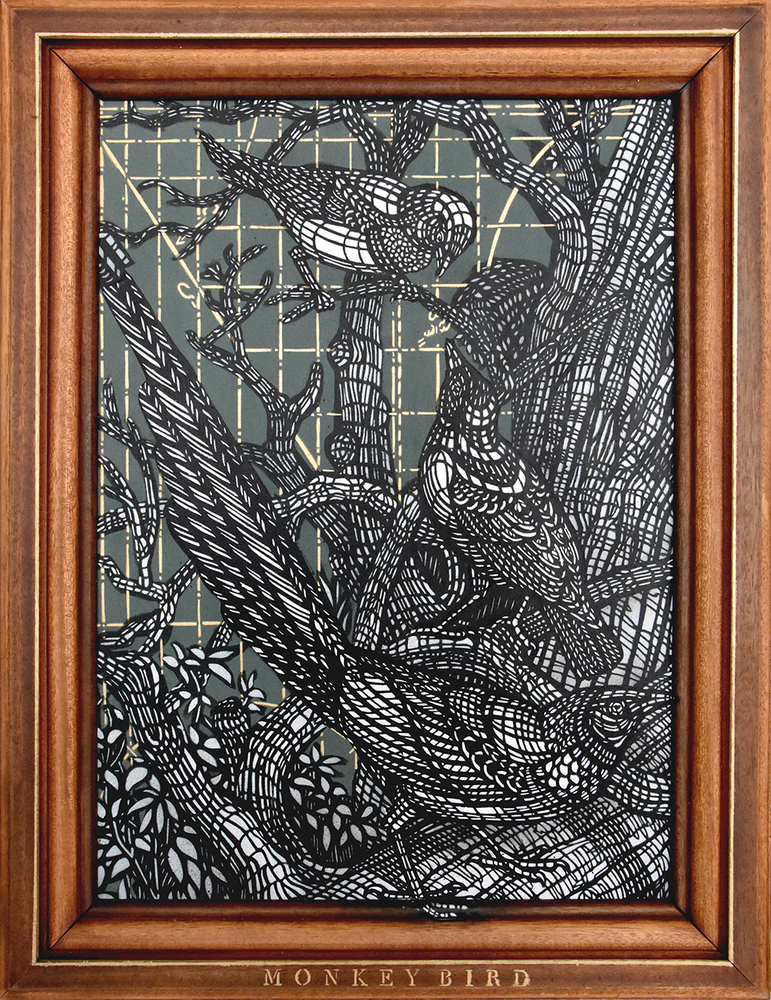 Pochoir, encre, acrylique sur bois et cadre ancien