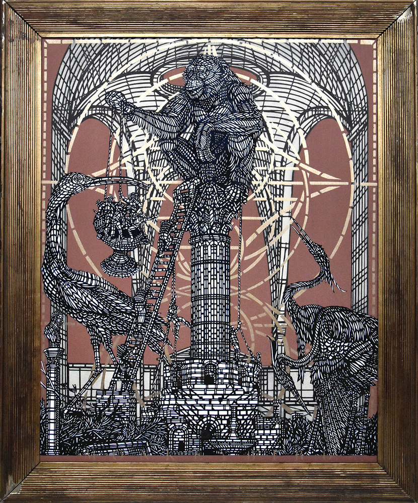 Pochoir, encre, acrylique sur toile et cadre ancien