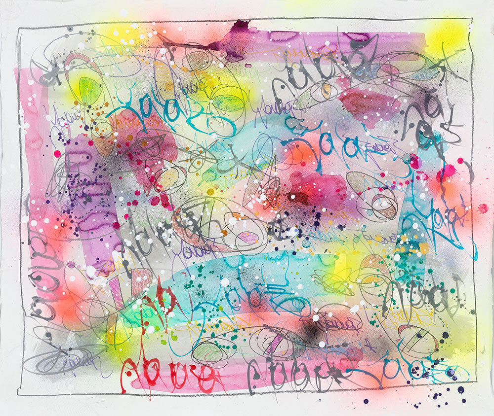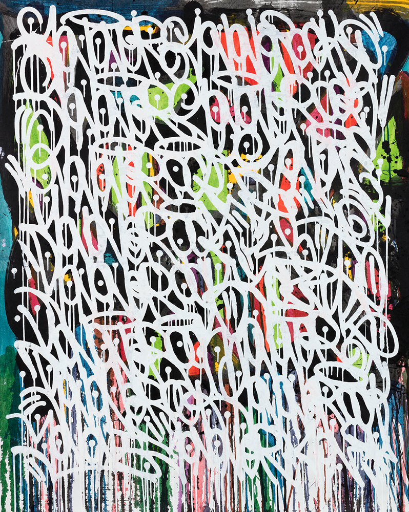 Encre, aérosol, crayon gras et pastel sur papier marouflé sur toile