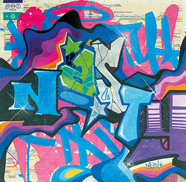 Peinture aérosol et gouache sur plan de métro