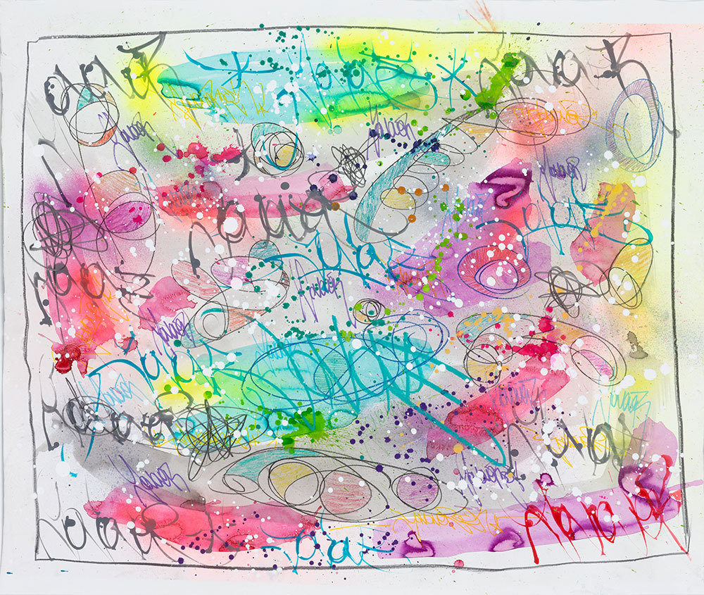 Encre, aérosol, crayon gras et pastel sur papier marouflé sur bois
